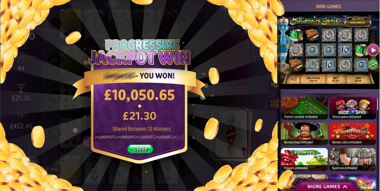 If a progressive jackpot is won, you'll see both the game jackpot and the PJP (progressive jackpot) rewards on a single winning message, like this: